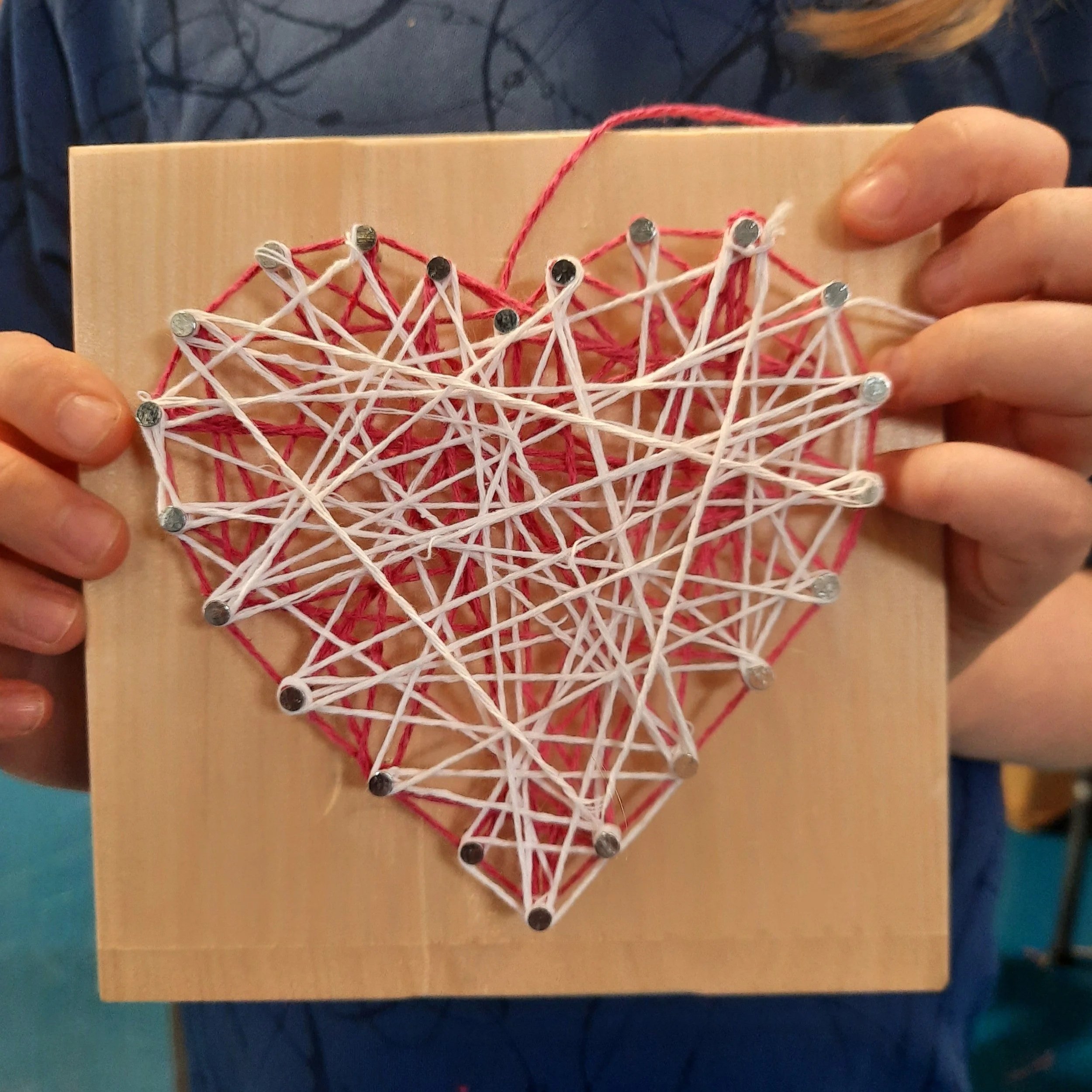 Kids learn to use a hammer and nails to make basic shapes before honing their fine motor skills as they use colourful wool to make their own patterns and shapes.